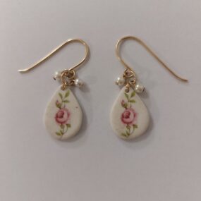 Gold-filled and ceramic drop earrings with a delicate rose print and white pearl beads. The drop length is approximately 2 cm. The drops are handmade, created in small series, featuring varied and changing floral prints.