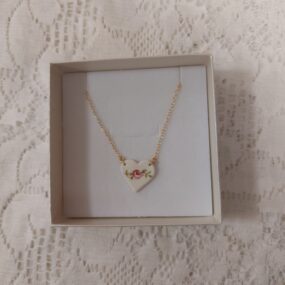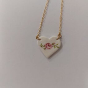 Gold-filled chain with a handmade ceramic heart pendant, featuring a delicate floral print.